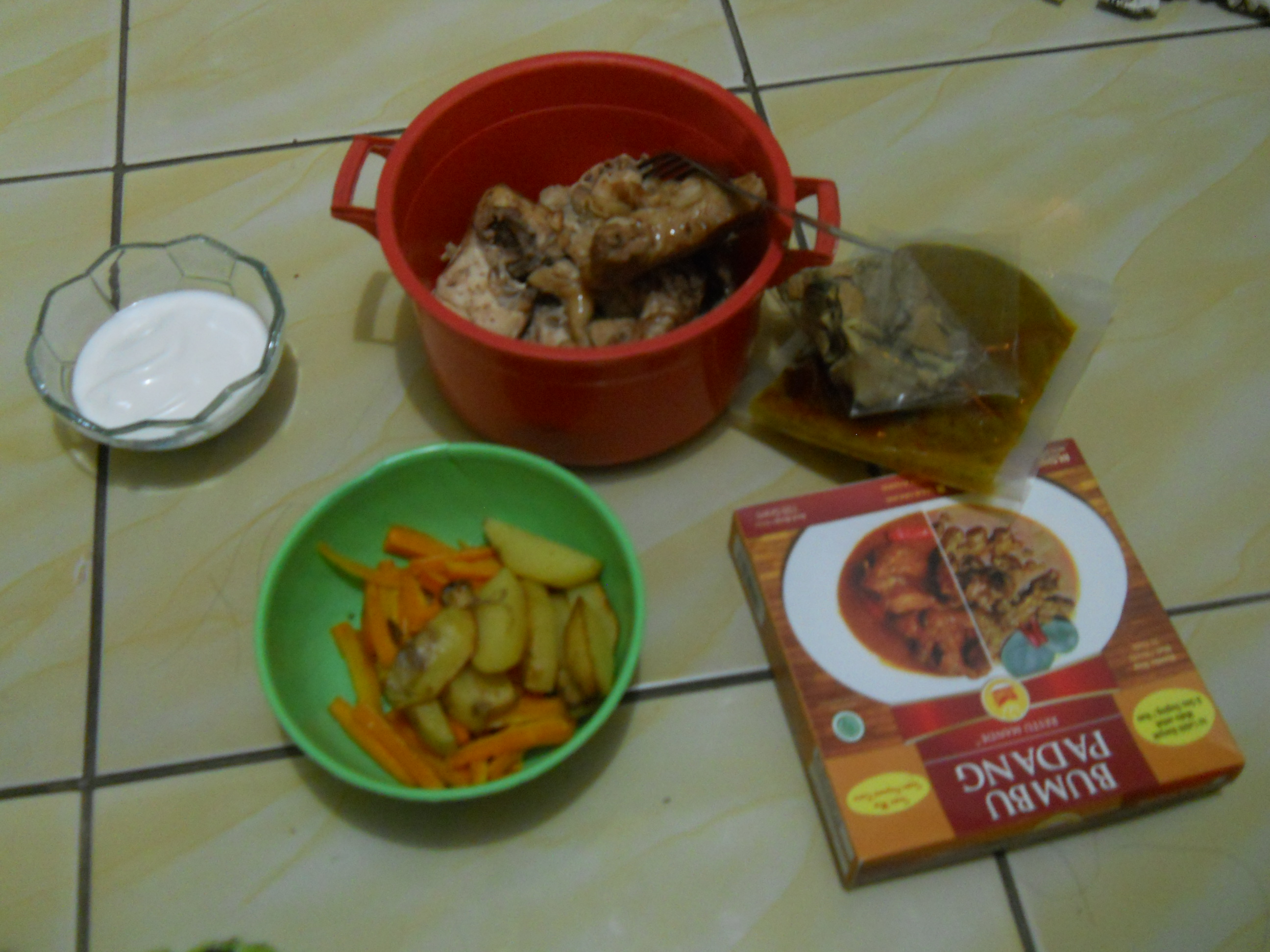 Aku pikir cerita ini akan selesai sampai memasak RANDANG PADANG. Nyatanya, temanku saat itu juga penasaran dengan bungkus Ayam Bumbu Rendang. Ia pun tak tanggung-tanggung, langsung menyediakan bahan-bahan berikut ini.