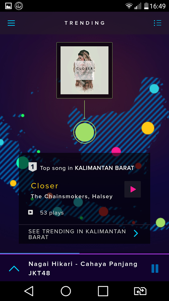 Kasus serupa terjadi juga di bagian Trending, yang memunculkan lagu-lagu trend di beberapa kota di Indonesia. Misalnya, kita bisa melihat lagu yang sedang trending di kota Makassar. Tiap kota punya haslil trending yang berbeda. Fitur ini akan maksimal jika aplikasi Langit Musik punya fitur untuk membandingkan lagu yang sedang ngetrend antara satu kota dengan kota lain.