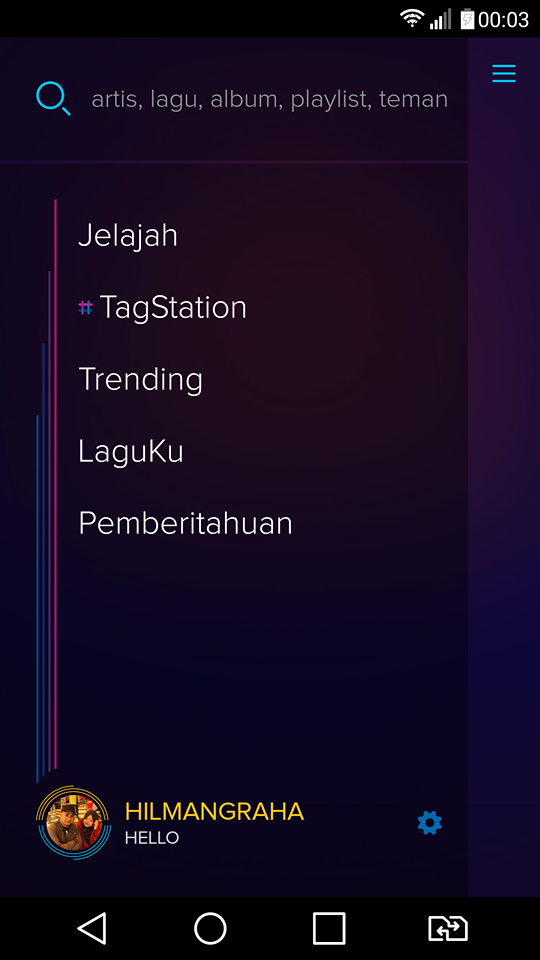 Menu utama aplikasi Langiat Musik terdapat lima kanal yang terdiri dari Jelajah, #TagStation, Trending, LaguKu, dan Pemberitahuan (versi Bahasa Indonesia. Saya akan bahas sedikit tentang fitur-fitur ini.
