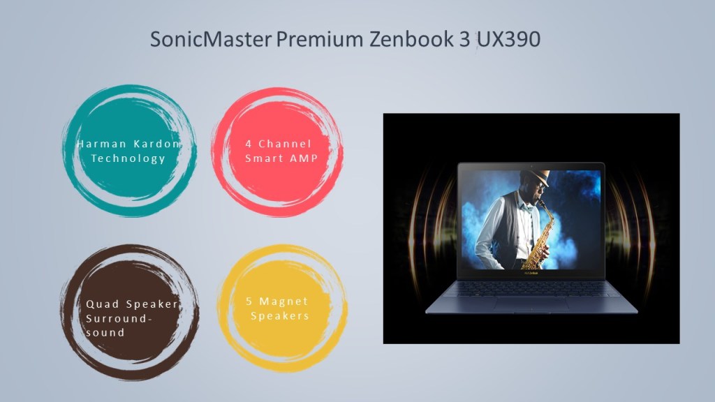 Seperti terlihat pada gambar, ada empat fitur atau teknologi yang tersemat di ZenBook 3 UX390. Keempat teknologi tersebut bertujuan untuk menghadirkan kualitas suara yang berkualitas, berdefinisi tinggi, dan juga memberikan kualitas suara layaknya kualitas suara di bioskop.