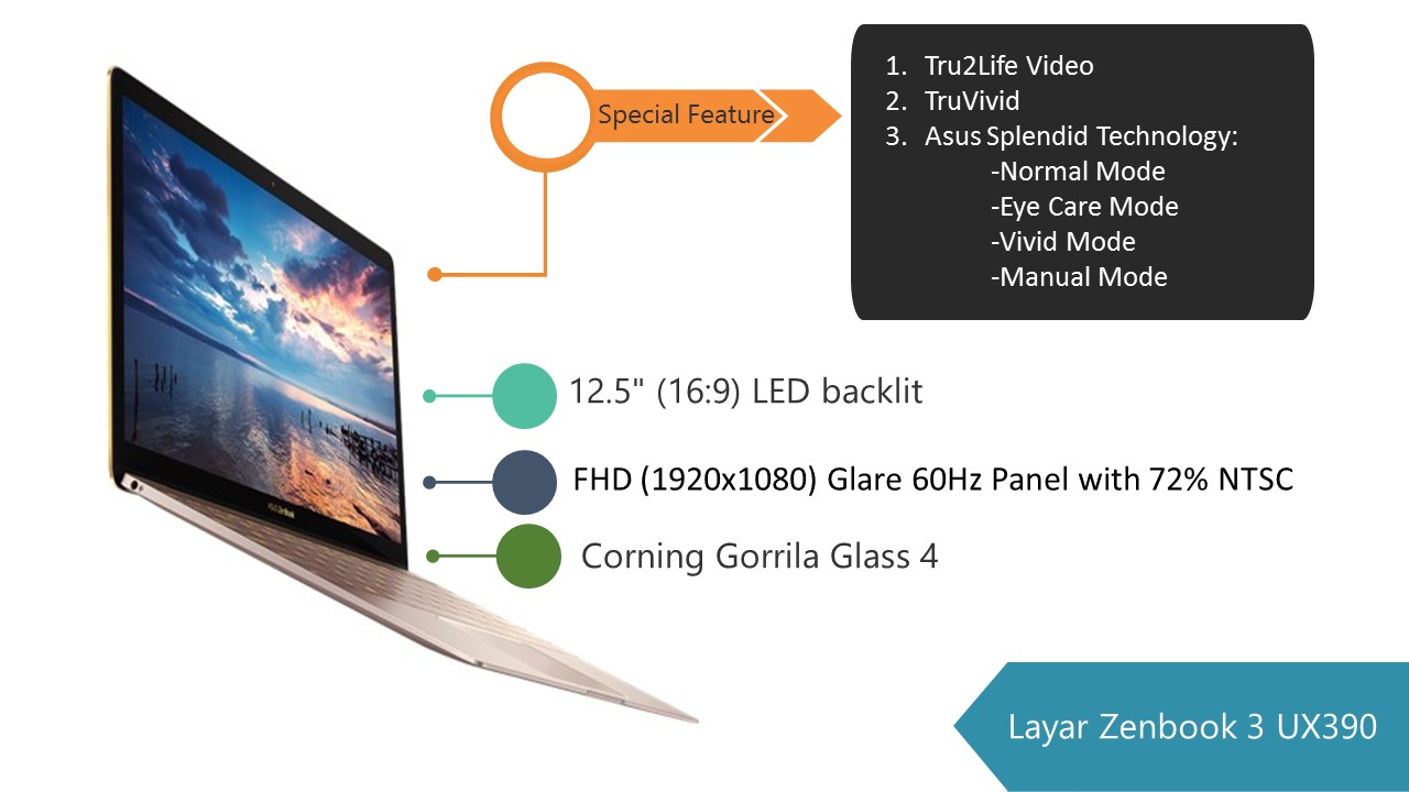 Untuk mengetahui detail spesifikasi layar ZenBook 3 UX390 bisa disimak pada gambar berikut.