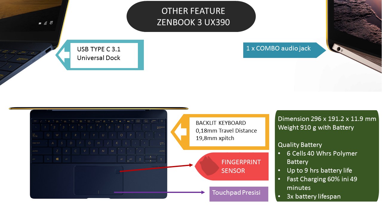 Selain keunggulan yang sudah disebutan, ZenBook 3 UX390 juga memiliki fitur-fitur lain. Fitur-fitur ini adalah pelengkap yang membuat ZenBook 3 UX390 memiliki nilai tambah sehingga layak untuk dipinang.