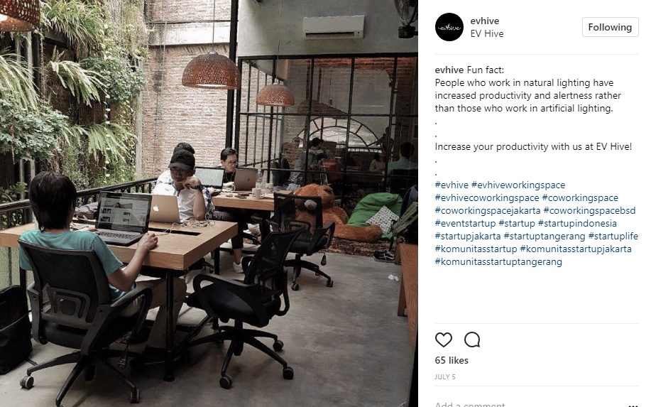 EV HIVE adalah contoh coworking space yang percaya bahwa berkantor di ruang kerja bersama tidak perlu mahal. Bagi mereka, ada yang lebih penting penting dari sekadar penyewaan tempat, yakni pengembangan ekosistem startup (perusahaan teknologi) di Indonesia itu sendiri.