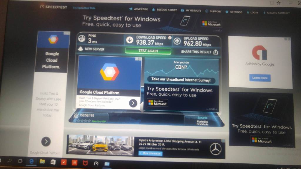 Mau bukti nih kecepatan internetnya apakah benar sampai 1Gbps? Ini buktinya, foto saat pengetesan kecepatan internet sampai 1Gbps.
