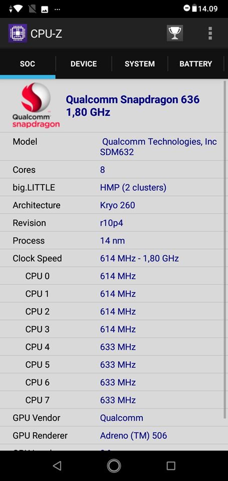 Dari informasi tersebut, jelas terlihat kalau Snapdragon 632 dibangun dengan proses teknologi 14nm. Terlihat juga kalau prosesor ini menggunakan Kryo dengan delapan inti prosesr (CPU 0 sampai CPU 7) dengan Adreno 506.