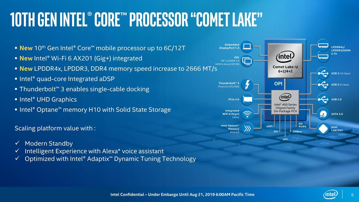 Prosesor Comet Lake ini merupakan prosesor Intel Core generasi ke-10 dengan fabrikasi 14mm yang lebih optimal. Seringkali juga disebut 14nm++++. Untuk laptop, tipe prosesor yang digunakan adalah tipe U yang sering nempel di akhir seri.