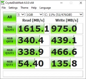 Untuk storage bawaanya sendiri, laptop ini hadir dengan Intel® Optane™ Memory H10 with Solid State Storage 512GB. Storage ini memiliki kecepatan baca dan tulis yang baik seperti terlihat pada hasil CrystalDisk Mark berikut ini.