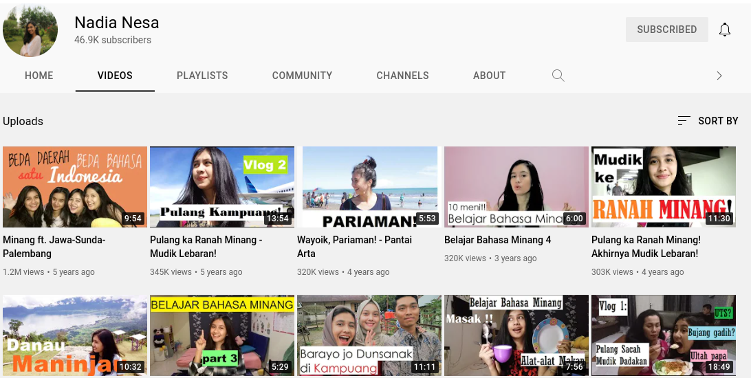Hal tersebut yang saya lihat dari Nadia Nesa. Saat artikel ini dibuat, jumlah subscriber perempuan yang berasal dari Bukittinggi, Sumatera Barat tersebut adalah 46 ribu. Jumlah tersebut tergolong tinggi untuk seorang Youtuber yang mengangkat tema dengan ceruk pasar tertentu.