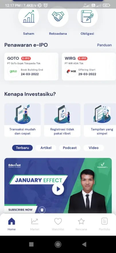 Selain itu, fitur market menampilkan berbagai saham kelas atas. Di market juga, ada fitur watchlist, yang memungkinkan saya untuk terus memantau saham tertentu.